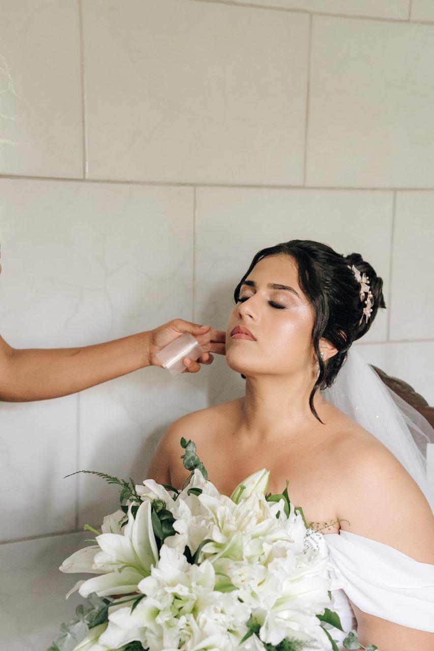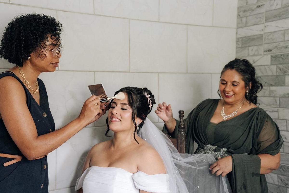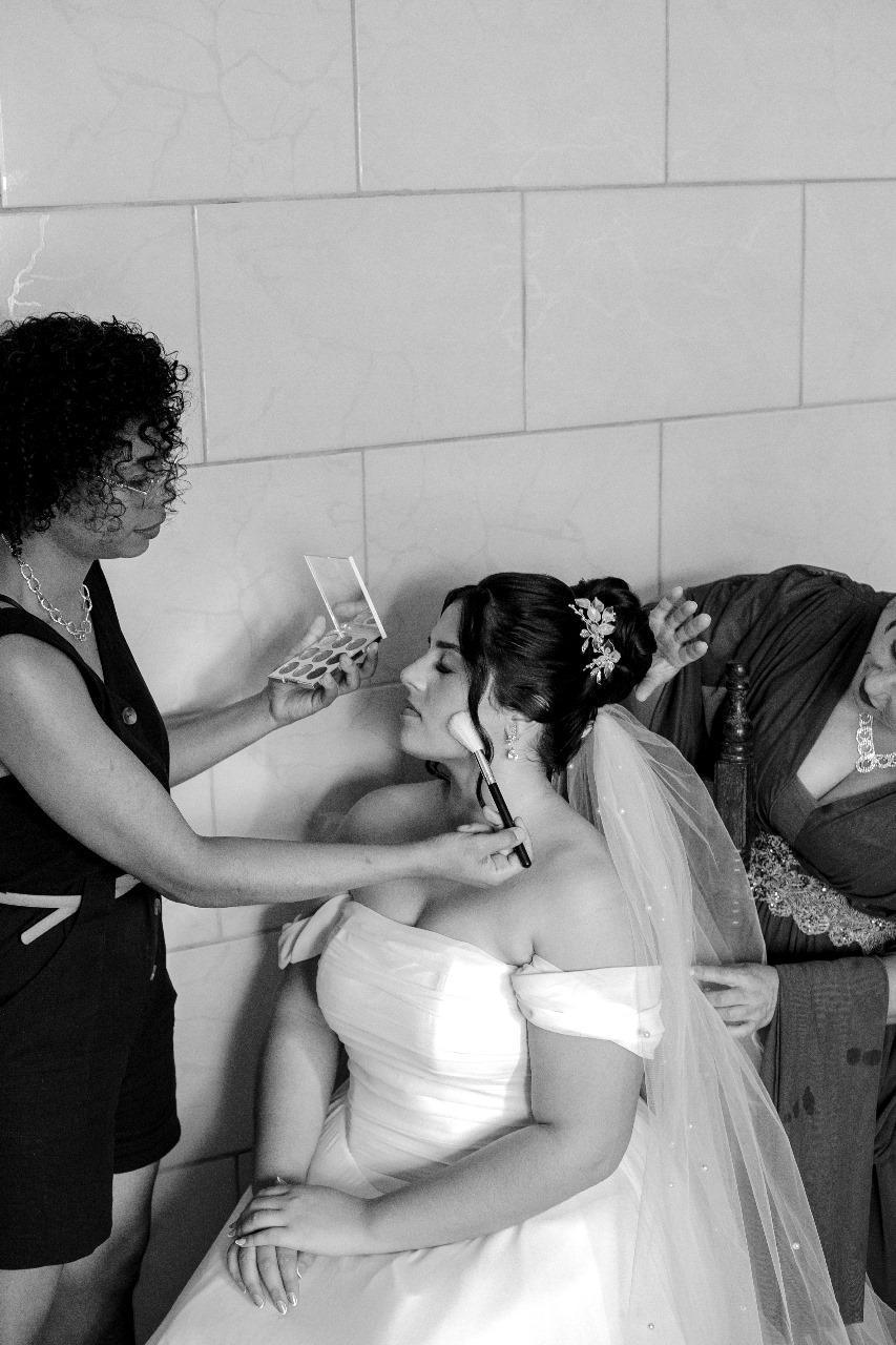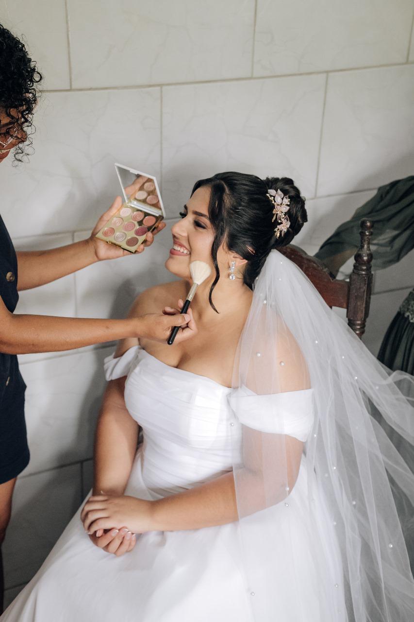A Bárbara escolheu uma produção romântica, leve e cheia de personalidade. Pele com viço natural, olhos suaves e um ar de noiva contemporânea e confiante.